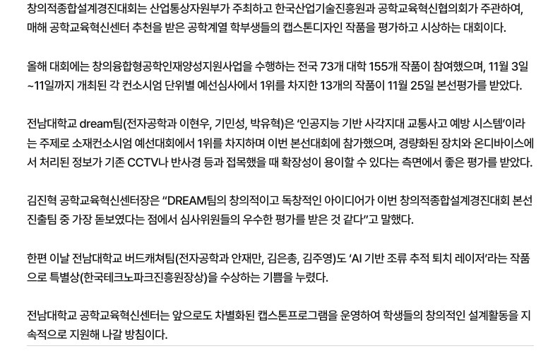 전남대 DREAM팀, 창의적종합설계경진대회 '최우수상' 쾌거